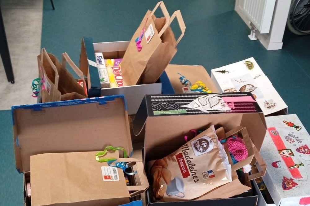 En vue des fêtes à venir, les locataires ont récolté et décoré méticuleusement des boites de chaussures, confectionnés des bonnets et des cartes de voeux. Ils ont aussi rassemblé des bonbons, des chocolats, des produits d'hygiène, des livres, des bijoux fantaisie et des petits sacs à mains pour les glisser dans les boites.